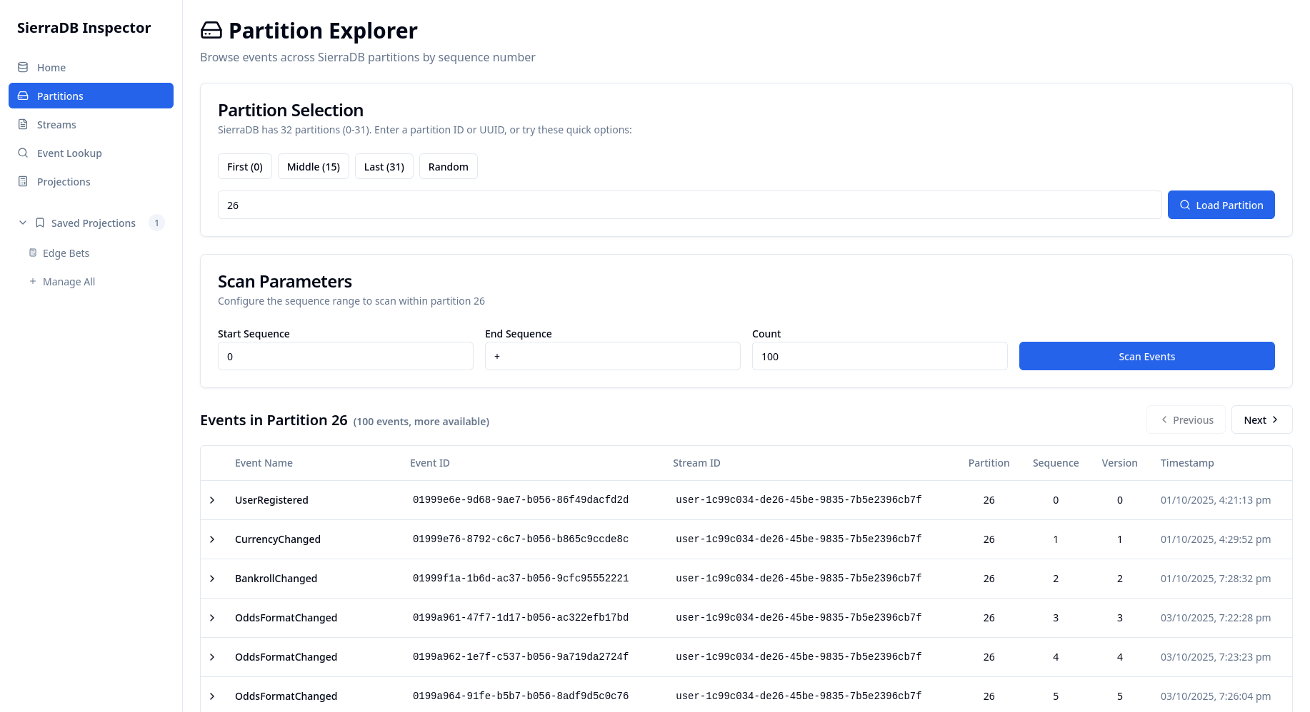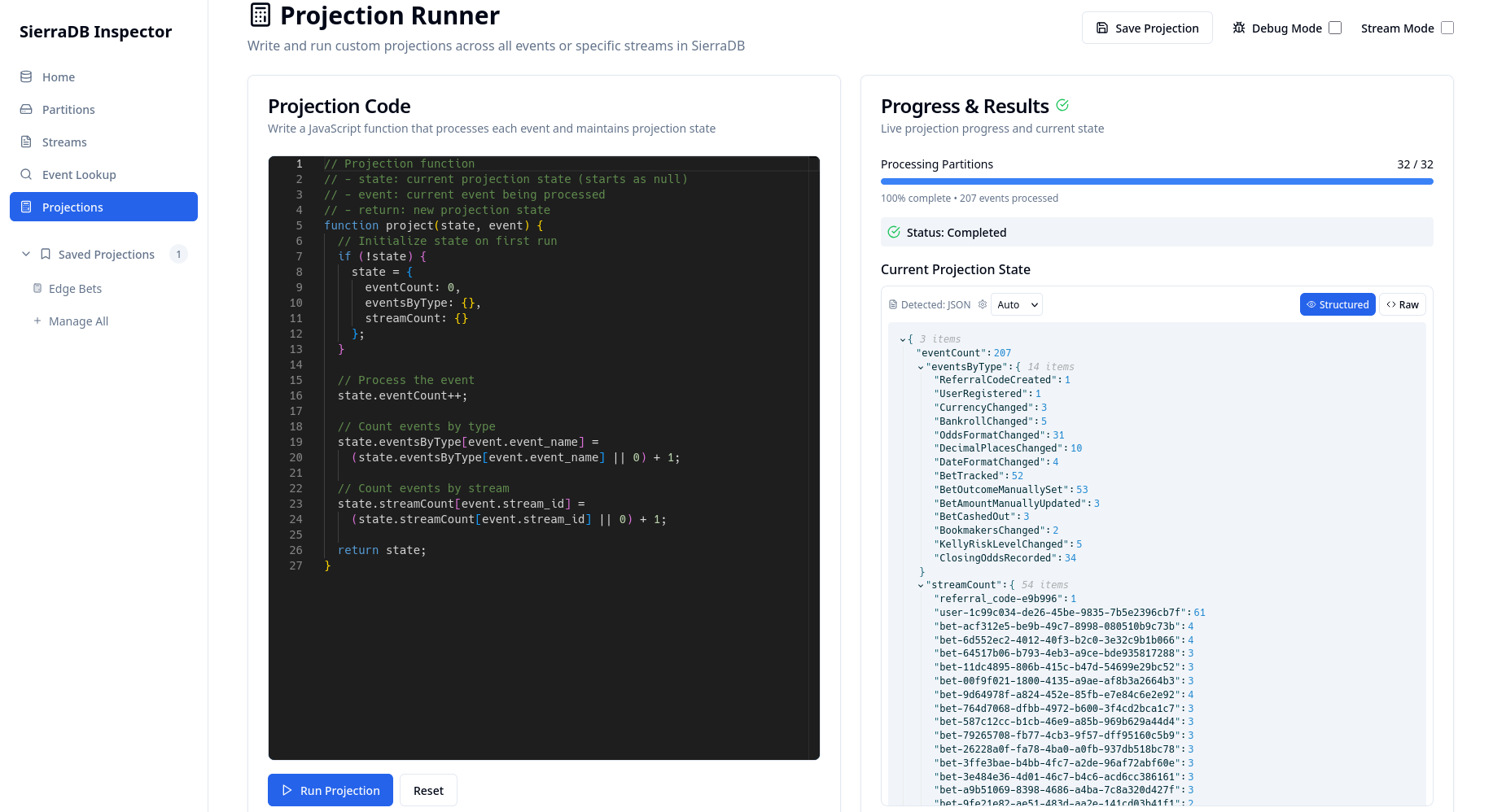 Database observability is crucial, especially for event sourcing where one of the huge benefits is seeing why events occurred. For this, SierraDB Inspector was built - a web interface for exploring events and running projections with JavaScript. Being able to quickly query and visualize your event streams makes debugging significantly easier.